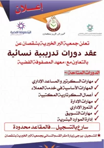 تعلن جمعية البر الخيرية بشقصان عن عقد دورة تدريبة نسائية اقرء المزيد » أكتوبر 10, 2024 لا توجد تعليقات